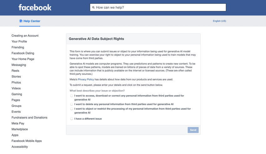 Na stronie internetowej Facebooka użytkownicy mogą wypełnić formularz "Generative AI Data Subject Rights". Pozwoli im to uzyskać dostęp, pobrać, poprawić lub usunąć wszelkie dane osobowe wykorzystywane do generatywnej sztucznej inteligencji.