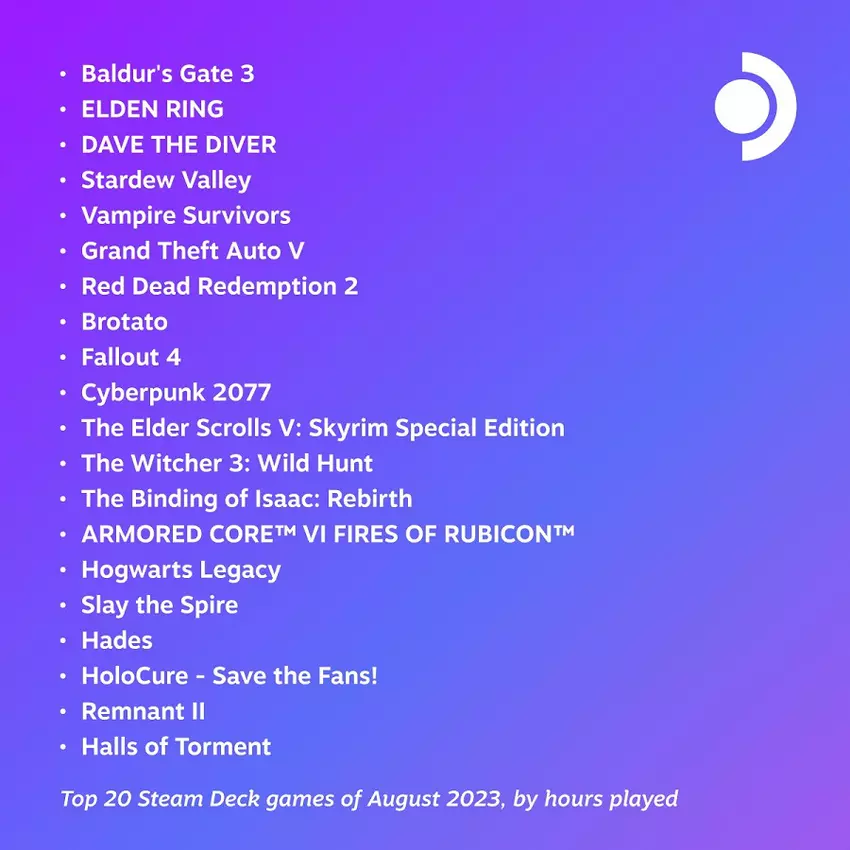 Top 20 najpopularniejszych gier sierpnia na Steam Deck pod względem ilości spędzonego czasu wygląda następująco:
