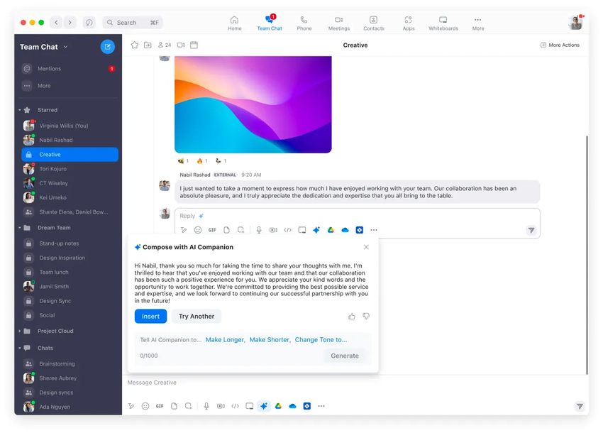Na przykład, AI Companion może zostać poproszony o informacje na temat statusu projektów, opierając się na transkrypcjach ze spotkań, czatów, tablic, e-maili, dokumentów, a nawet aplikacji innych firm. Użytkownicy będą mogli zadawać pytania cyfrowemu asystentowi podczas spotkania, aby wyjaśnić kluczowe punkty, tworzyć i przesyłać prośby o wsparcie oraz tworzyć odpowiedzi na zapytania.