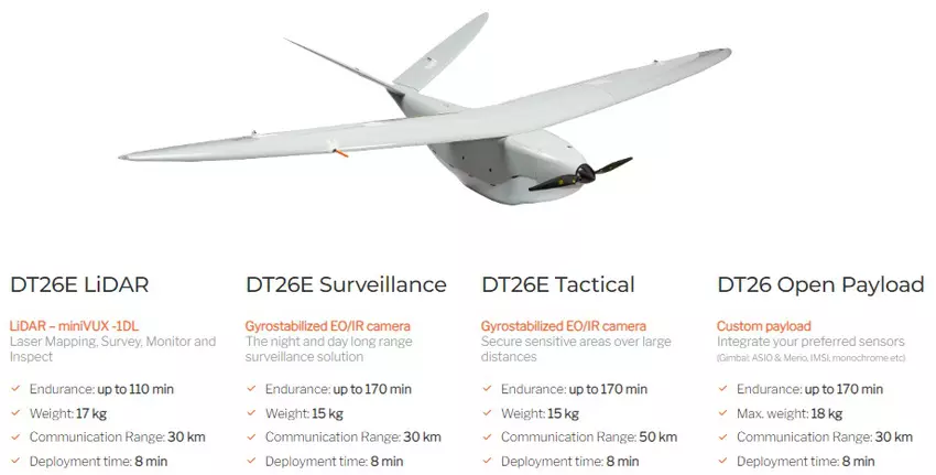 Drugim UAV jest Delair DT26 (na zdjęciu powyżej). Ten dron jest dostępny w czterech wariantach: LiDAR, Surveillance, Tactical i Open Payload. Specyfikacje różnią się w zależności od modelu. Maksymalny czas lotu wynosi 170 minut, masa startowa 18 kg, a zasięg 50 km.