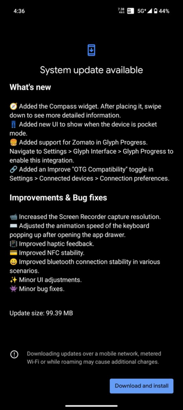 Aktualizacja została wydana z numerem kompilacji Nothing OS 2.0.3. Oprogramowanie układowe zawiera szereg poprawek i kilka innowacji. Na przykład deweloperzy poprawili łączność NFC, Bluetooth i haptyczne sprzężenie zwrotne. Dodali również ulepszony dyktafon, widżet kompasu na pulpicie, zaktualizowany interfejs, a także obsługę Glyph dla aplikacji Zomato i nie tylko.