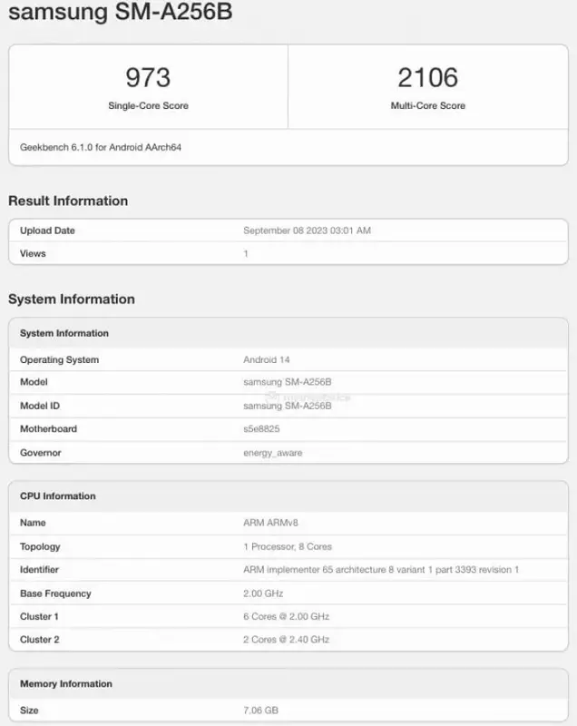 Samsung Galaxy A25 5G z układem Exynos 1280 i systemem operacyjnym Android 14 przetestowany w Geekbench 6