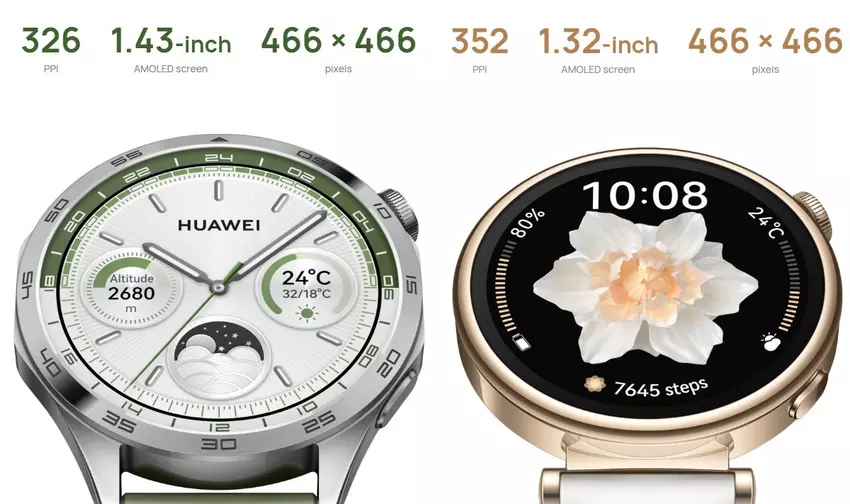 Huawei Watch GT4 jest dostępny w dwóch wariantach. Pierwszy z nich ma rozmiar 41 mm. Zegarek wyposażony jest w wyświetlacz AMOLED o rozdzielczości 466 x 466 pikseli i średnicy 1,32". Mogą pracować przez dwa dni z aktywnym trybem Always-on Display. Maksymalny czas pracy bez ładowania wynosi 7 dni.