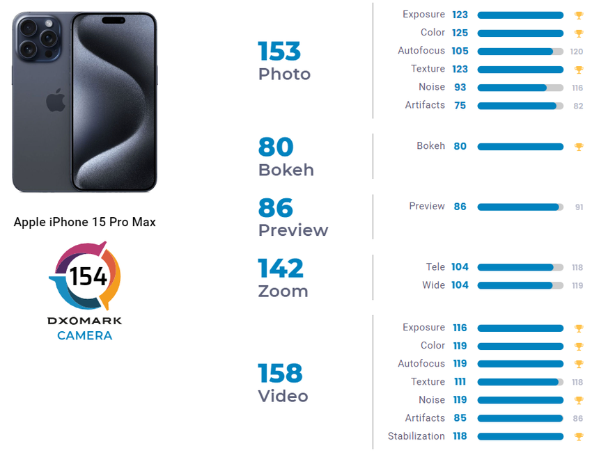 Smartfon otrzymał 153 punkty za zdjęcia i 158 punktów za wideo. W wielu kategoriach iPhone 15 Pro Max został liderem, ale to nie wystarczyło, aby znaleźć się na szczycie rankingu. Z wynikiem 154 punktów nowość Apple zajęła drugie miejsce, za Huawei P60 Pro.