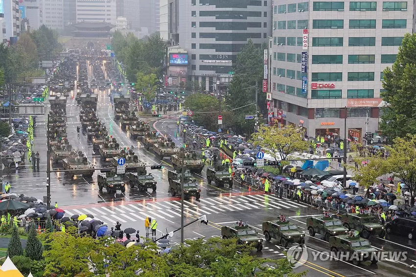 Jeśli chodzi o paradę wojskową, Seul zaprezentował ponad 170 sztuk sprzętu wojskowego. Wśród nich znalazły się czołgi K2 Black Panther, haubice K9 Thunder, wyrzutnie rakiet i bezzałogowe statki powietrzne. Zaplanowane loty śmigłowców AH-64 Apache i myśliwców piątej generacji F-35 Lightning II zostały odwołane z powodu złej pogody.