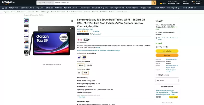 - Samsung Galaxy Tab S9, 256 GB - check price on amazon,01 € check price on amazon,00 €, check price on amazon.