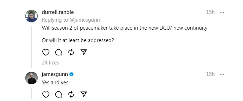 Reżyser jest już w trakcie pisania scenariusza do drugiego sezonu Peacemaker, jednego z kolejnych projektów DC Studios. Ponadto w Threads Gunn odpowiedział na pytanie fana o to, czy Peacemaker będzie częścią nowego uniwersum DC: "Tak i tak" - napisał reżyser.