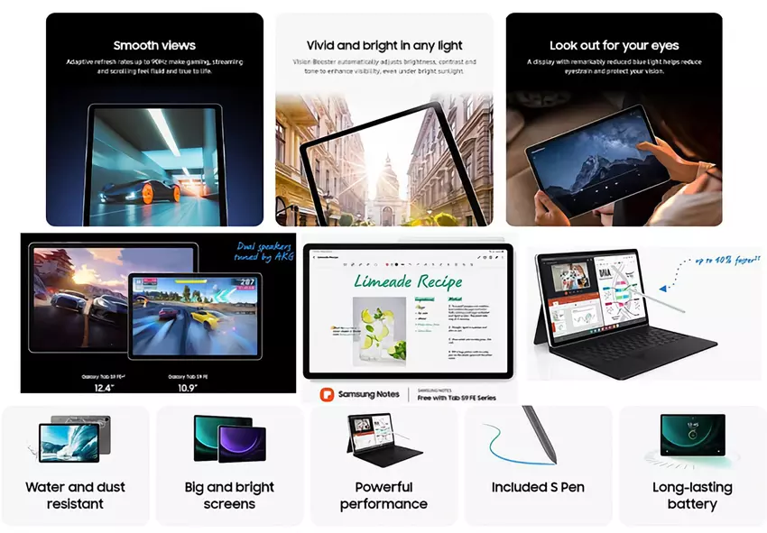 Samsung Galaxy Tab S9 FE i Galaxy Tab S9 FE+: linia tabletów z ekranami do 12,4″, odświeżaniem 90 Hz, stopniem ochrony IP68 i obsługą rysika S Pen