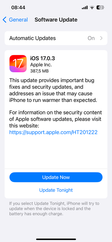 Oprogramowanie układowe nosi nazwę iOS 17.0.3, a numer kompilacji to 21A360. System waży około 400 MB i już zaczął być wdrażany falami do wszystkich obsługiwanych modeli iPhone'a na całym świecie.