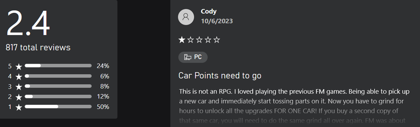 Sytuacja na Xbox Store również nie jest najlepsza. Tam Forza Motorsport otrzymała 2,4 na 5. Gracze wyrażają taką samą krytykę jak na Steam.