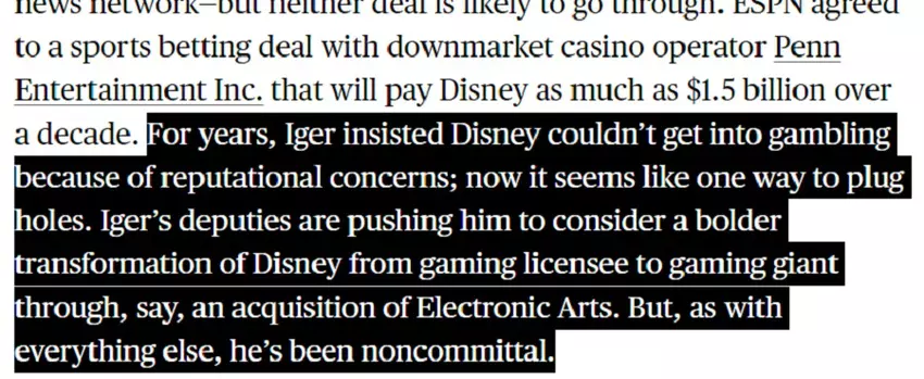 W tym momencie Iger waha się, czy wykonać ten ruch, ale biorąc pod uwagę tempo branży gier wideo i pieniądze, które przynosi, Bob Iger może w każdej chwili złożyć ofertę, której EA nie będzie w stanie odrzucić.