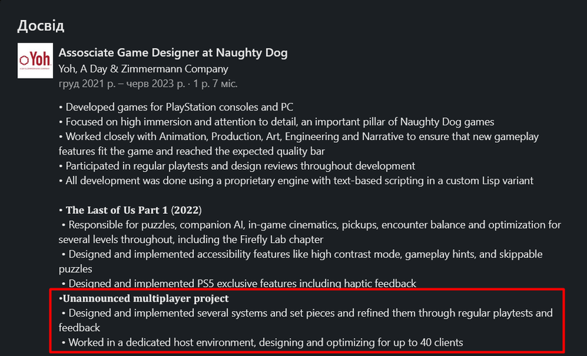 Profil LinkedIn Iana Blake'a, który był projektantem gier w Naughty Dog do czerwca 2023 roku, ujawnił, że pracował w studiu nad niezapowiedzianym projektem online, którym prawdopodobnie jest gra wieloosobowa The Last of Us. Wskazał, że tworzy lobby obsługujące do 40 graczy, a także tworzy inne systemy. Czyli mieliśmy spodziewać się trybu 20v20 na dużą skalę, ale czy kiedykolwiek go zobaczymy, pozostaje wielką niewiadomą.