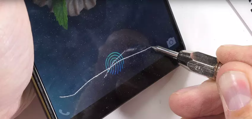 w Vivo X20 Plus UD całkiem normalny ekran dla nowoczesnych smartfonów jest on odporny na standardzie zarysowania. Dlatego bloger sprawowana sondy kwarcu 7-te stopień twardości skali Mohsa. Po pierwsze, Zrobiłem kilka zadrapań skaner biometryczny. Skaner działa. Następnie, kilka zadrapań stały cała siatka, ale Skaner nadal pracował. Szkło pęknięty tylko po bloger mocno wciśnięty w sondzie jeden i samo miejsce na Przez dziesięć sekund.
