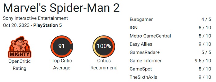 Zgodnie z oczekiwaniami, nowy tytuł na wyłączność PlayStation będzie jedną z najwyżej ocenianych gier 2023 roku. Krytycy zgadzają się, że jest to świetna gra, która pod każdym względem przewyższa Marvel's Spider-Man Part 1 i spin-off Miles Morales.