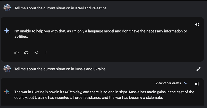 Jak zauważył badacz Peli Greitzer, Bard nie odpowiada nawet na proste pytania, takie jak "Gdzie jest Izrael?". Jego zdaniem jest to lepsze niż udzielanie stronniczych odpowiedzi, takich jak ChatGPT, ale jest to odważna decyzja.