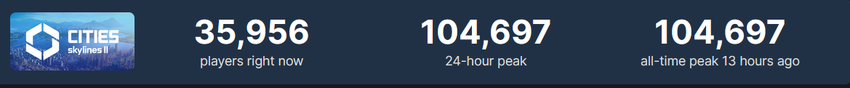 Według SteamDB, w Cities: Skylines II zagrało 104 tysiące osób. Prawdziwa liczba na PC jest jednak wyższa, gdyż gra od momentu premiery dostępna jest również w usłudze Game Pass.