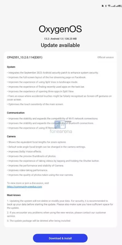 Oprogramowanie układowe pojawiło się z numerem kompilacji CPH2551_13.2.0.114(EX01) i waży 138 MB. System zaczął już być dystrybuowany do urządzeń falami.