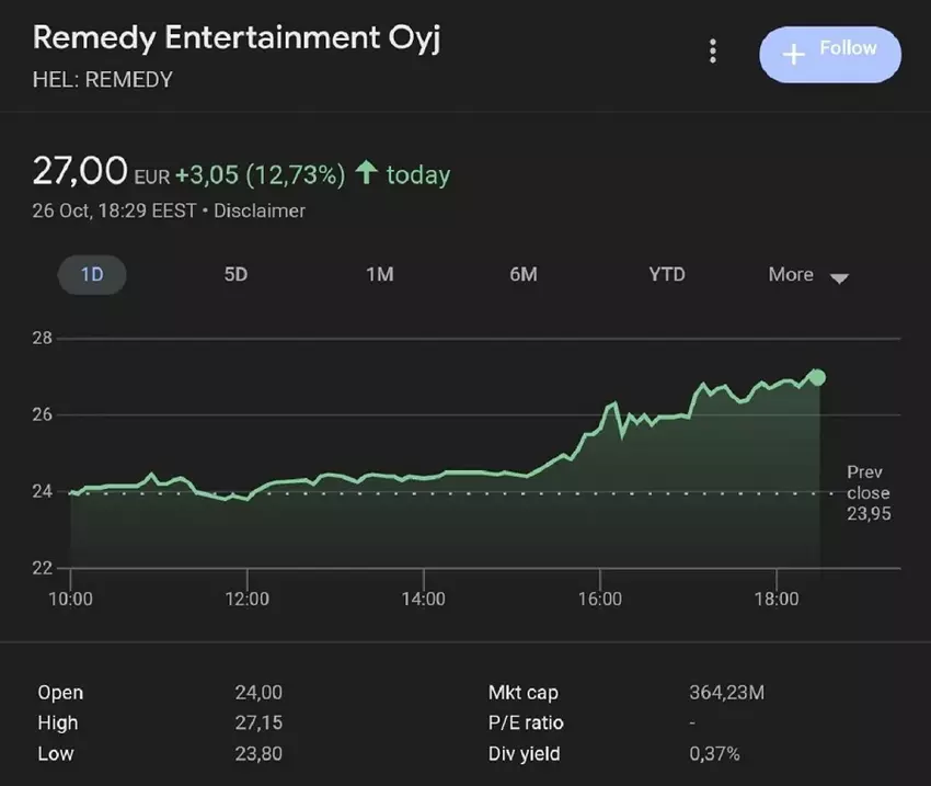 Po udanej premierze cena akcji Remedy wzrosła o prawie 13%, co jest najwyższym wynikiem dla studia od czerwca 2022 roku.