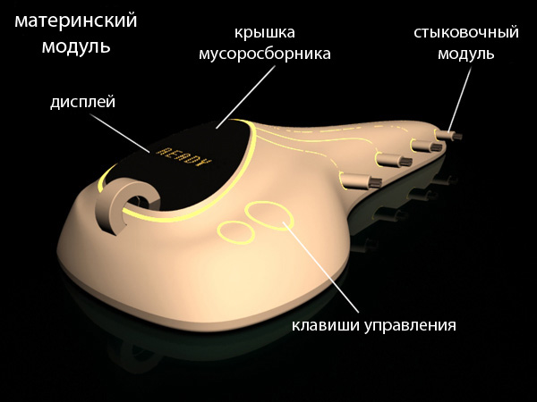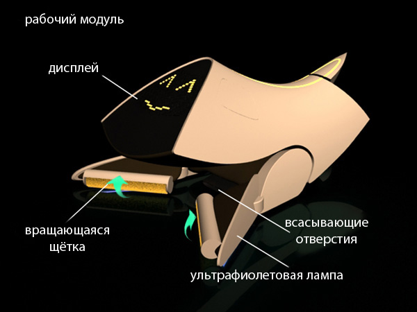 Robosobaki i robopylesosy wynalazcy Haunt. (Hyun-Seok Kim) Autor tego Hyun-Seok Kim oferowane do przekroczenia obu tych pojęć, wprowadził pojęcie domu zautomatyzowany kompleks żniwny z ludzką twarzą psa. Stacja Dokingovaya znajduje się na ścianie i wygląda jak pies, matka, i cztery zwinny robopylesosa służyć jako szczenięta, jednocześnie wykonując pracę sprzątanie domu. U macicy robota ma duży pojemnik do zbierania śmieci, który jest wypełniony za pomocą specjalnego kanału przy połączeniu z modułem dokująca roboschenka. Wszystkie pięć robotów wyposażonych w wyświetlacze o „twarzy” i zrobotyzowanych szczeniąt stosowanych w antenie zamontowany jest w ogonie. Małe roboty mogą odtwarzać muzykę przez wbudowane głośniki i służyć małym domku kwartet. Pozostaje zrozumieć dlaczego zastąpienie jednego robota do pięciu, ale pomysł wygląda śmiesznie.