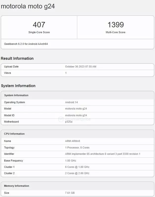 Model układu nie jest określony, ale o wiele ważniejsza jest wersja systemu operacyjnego. Według Geekbench 6.2, Moto G24 5G otrzyma Androida 14. Może to być pierwszy budżetowy smartfon z nowym systemem operacyjnym zaraz po wyjęciu z pudełka.