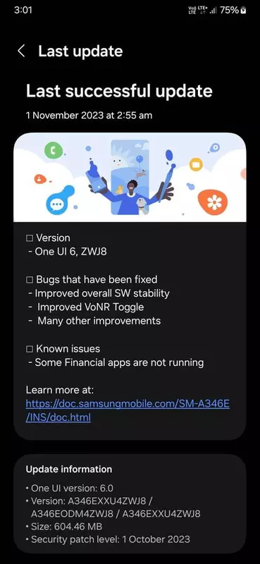 Aktualizacja zawiera poprawki błędów, zwiększoną stabilność systemu oraz ulepszoną funkcję przełączania VoNR ("Voice over New Radio"). W oficjalnym dzienniku aktualizacji Samsung wspomina również, że niektóre aplikacje finansowe nadal nie działają poprawnie. Firma może naprawić te problemy w nadchodzących wersjach beta systemu.