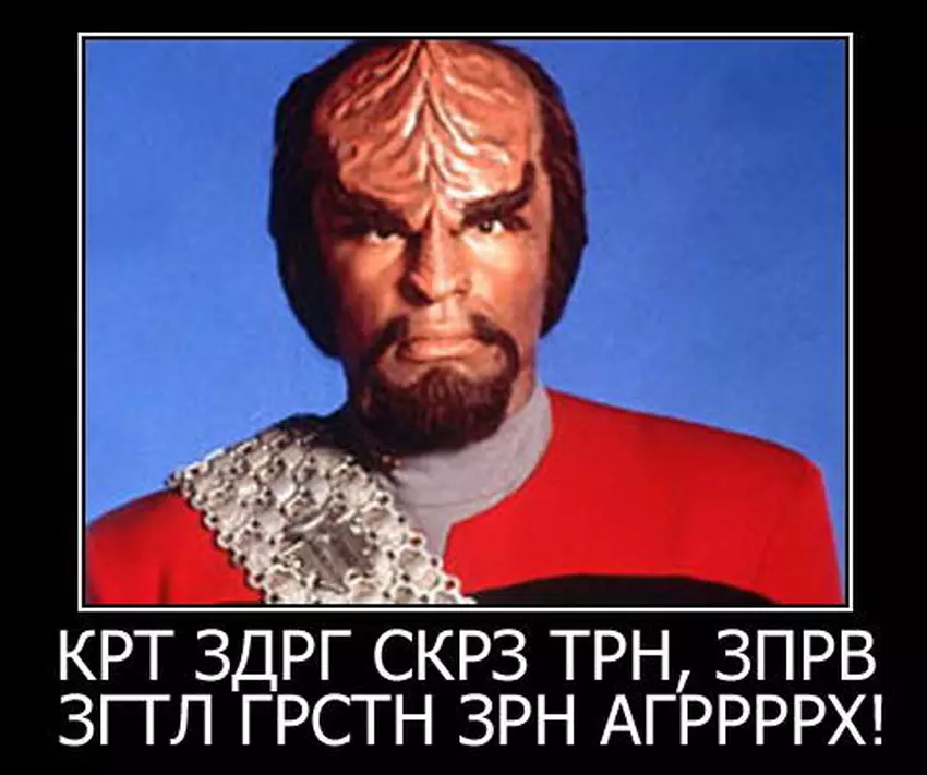na język, w serial „Star Trek” rozmowy Klingon cywilizacji - Wojownicy humanoidalnych. ich Seria język stworzony linguist Marc Okrand. Mark najpierw dyskretnie tak kochał dźwięk twórców serialu, że Paramount studio zamówił jego rozwój pełnego Język klingoński na show. Okrand wykorzystywane zarys Ducha i ich połączeniu z elementy języków Indian Ameryki Północnej, a również z Otrzymany w ten sposób fragmenty sanskrytu opracowane gramatyki język, składni i Słownik objętość wystarczy.