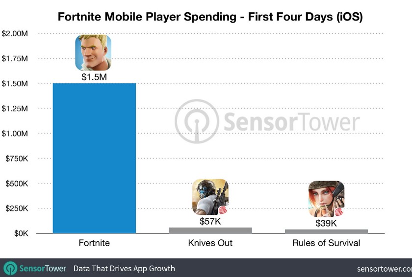 Marketing Company Sensor Wieża opublikował raport opisujący mobilnych Fortnite osiągnięć w ciągu pierwszych czterech dni od wersji beta. W tym czasie gra udało się podnieść $ 1,5 milionów dolarów na zakupy w grach. Creation Epic Games gra stała się drugim najlepiej sprzedającym się w App Store.