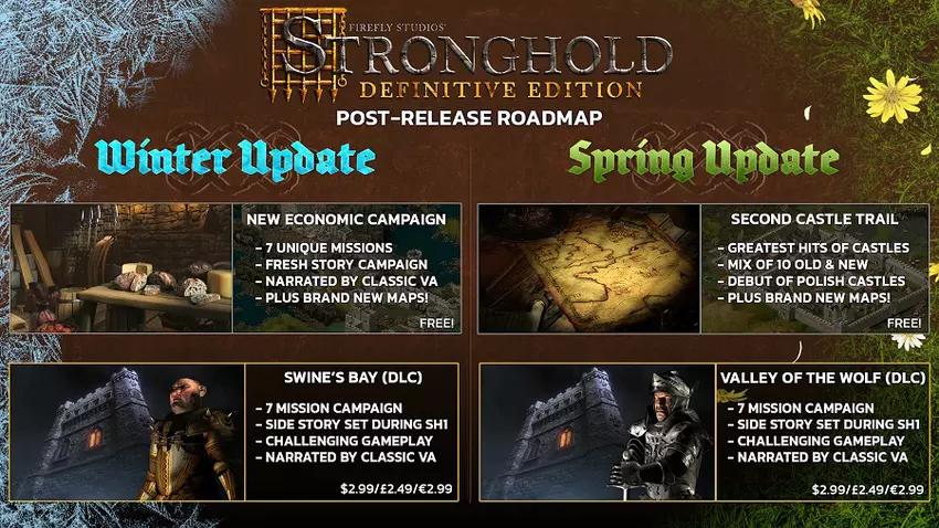 W planach są dwa duże dodatki (kosztujące zaledwie 3 dolary) do Stronghold: Swine's Bay i Valley of the Wolf, a także szereg darmowych aktualizacji, w tym kampania ekonomiczna i zaktualizowany szlak Drugiego Zamku.