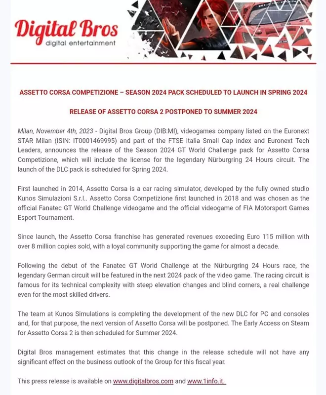 Jak poinformowało Digital Bros (spółka matka studia Kunos Simulazioni), deweloperzy nie zdążą wydać gry przed latem 2024 roku.