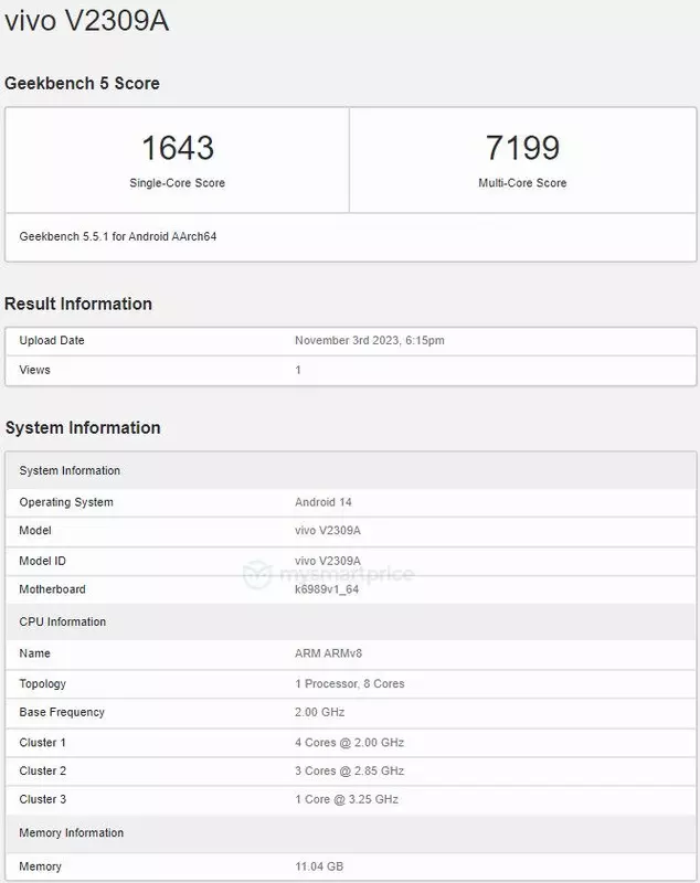 Mówimy o modelu vivo X100. Gadżet działa z numerem modelu V2309A. Przeciek potwierdza, że smartfon będzie wyposażony w nowy procesor MediaTek Dimensity 9300 z najwyższej półki. Układ ma pojedynczy rdzeń Cortex-X4 taktowany zegarem 3,25 GHz, trzy rdzenie Cortex-X4 taktowane zegarem 2,85 GHz i cztery rdzenie Cortex-A720 taktowane zegarem 2,0 GHz w oparciu o architekturę Armv9. Gadżet otrzyma również 12 GB pamięci RAM i system operacyjny Android 14 po wyjęciu z pudełka.