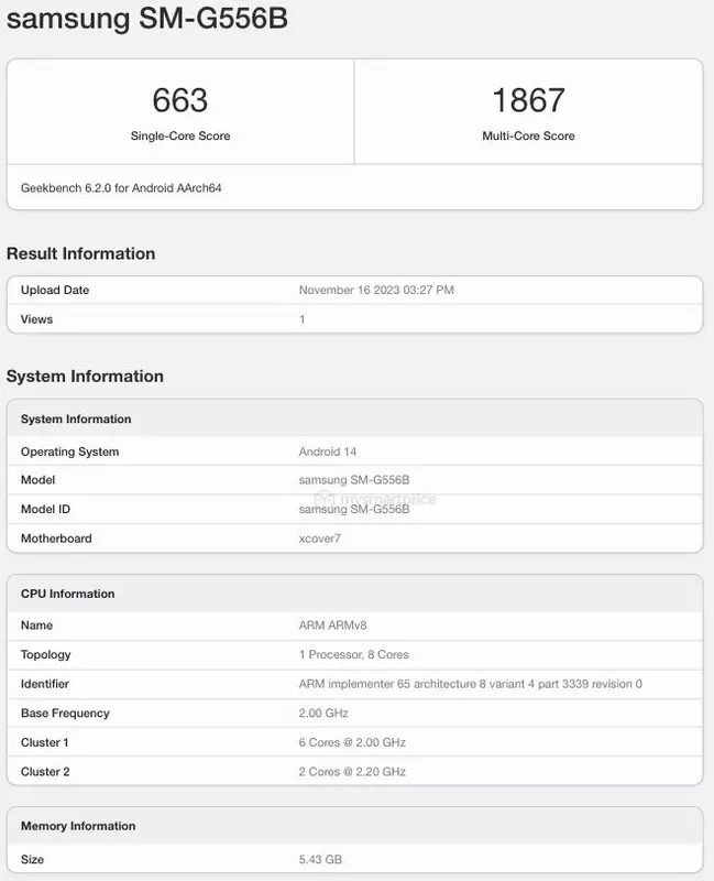 Gadżet przechodzi z numerem modelu SM-G556B. Według raportu smartfon będzie obsługiwał procesor MediaTek Dimensity 6100+. Jest to ośmiordzeniowy układ o maksymalnej częstotliwości taktowania 2,95 GHz. SoC posiada wbudowany modem dla sieci piątej generacji. Oprócz tego smartfon otrzyma 6 GB pamięci RAM i system operacyjny Android 14. Nawiasem mówiąc, Galaxy XCover 7 uzyskał 663 punkty w teście wydajności jednordzeniowej i 1867 punktów w teście wielordzeniowym.
