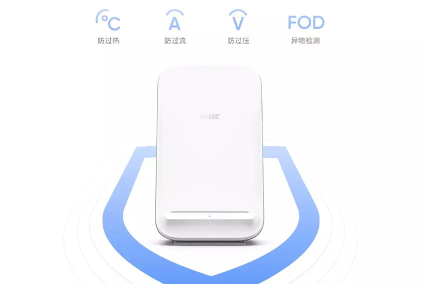 Mowa o bezprzewodowej stacji ładującej AirVOOC. Nowość może pochwalić się konstrukcją z dwiema cewkami i mocą wyjściową 50W. Urządzenie jest zasilane przez zasilacz o mocy 65 W lub 80 W. Nowość obsługuje również protokoły Qi EPP i Qi BPP z ładowaniem odpowiednio 15W i 5W. Stacja dokująca posiada system chłodzenia powietrzem, który utrzymuje niską temperaturę telefonu. Ładowarka jest również wyposażona w kilka mechanizmów zabezpieczających: przed przegrzaniem, skokami napięcia itp.