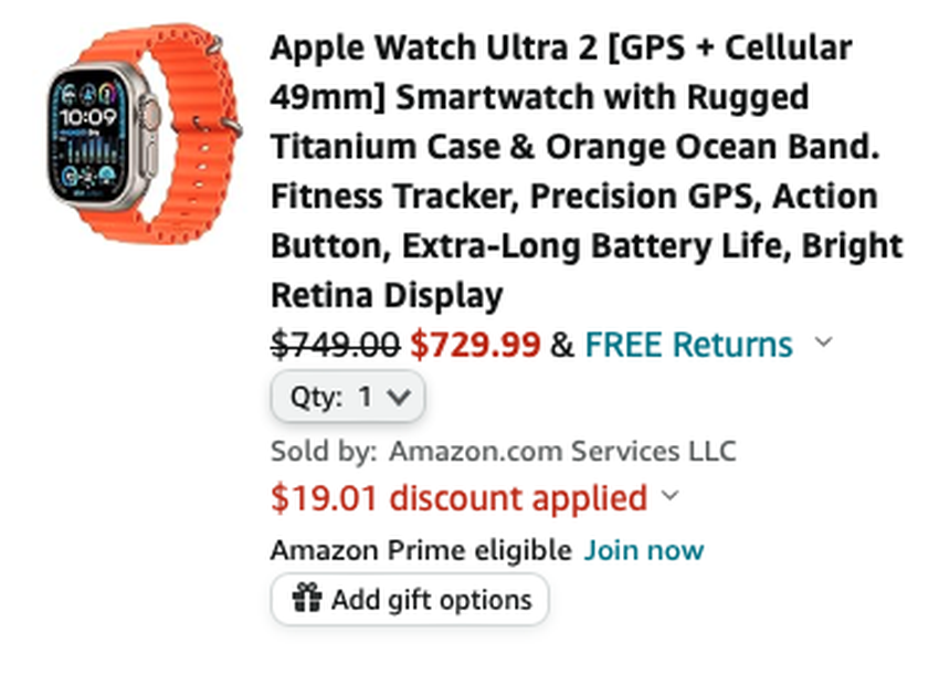 Mowa o Apple Watch Ultra 2. Gadżet kosztuje check price on amazon. Zegarek jest dostępny z różnymi paskami, ale jeśli kupisz wersję z Orange Ocean Band, możesz otrzymać kupon z dodatkową zniżką w wysokości 19 USD.