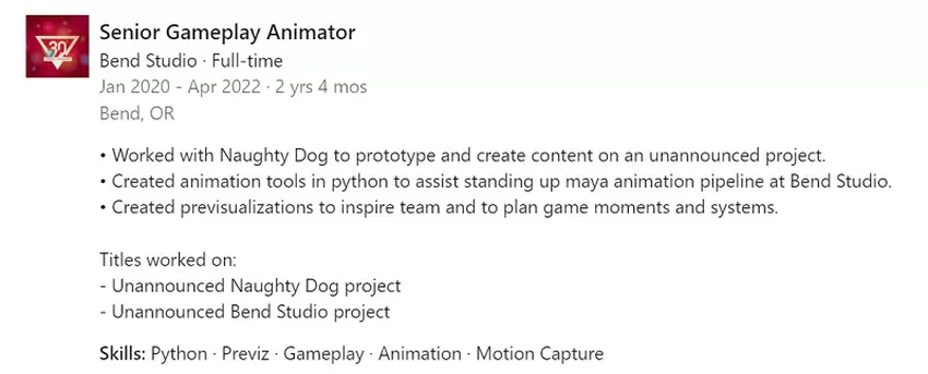 Strona LinkedIn byłego starszego animatora Bend Studio Adama Lawsona (Adam Lawson), który pracuje już w Archetype Entertainment, wskazuje, że przynajmniej w okresie od 2020 do 2022 roku jego studio pracowało nad niezapowiedzianą grą ze słynnym studiem Naughty Dog - twórcą The Last of Us i Uncharted.