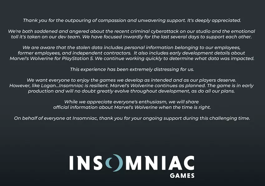 Zespół Insomniac Games dziękuje wszystkim, którzy wyrażają swoje wsparcie i stwierdza, że incydent na pewno nie doprowadzi do anulowania Marvel's Wolverine, a także innych projektów. Firma jest zdeterminowana, aby nadal zachwycać swoich fanów najwyższej klasy grami i nie odstąpi od swoich planów.