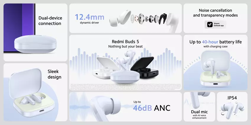 Słuchawki są wyposażone w Bluetooth 5.3, przetworniki 12,4 mm z tytanową membraną i system audio z aktywną redukcją szumów (ANC). Może on tłumić obce dźwięki do 46 dB. Jeśli chodzi o żywotność baterii, wytrzyma ona do 40 godzin (z etui). Redmi Buds 5 można dostosować za pomocą zastrzeżonej aplikacji na smartfonie. Słuchawki obsługują funkcję Google Fast Pair i są wyposażone w stopień ochrony IP54.