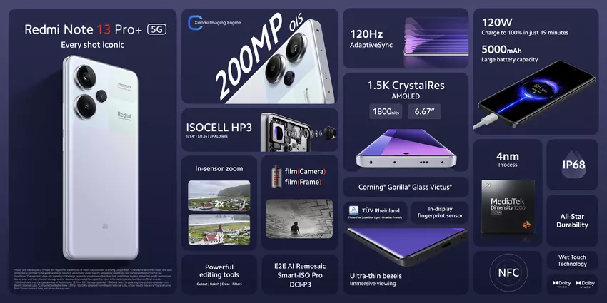 Nowość wyposażona jest w aparat główny o rozdzielczości 200 MP + 8 MP + 2 MP. Głównym modułem jest Samsung ISOCELL HP3. Rozdzielczość aparatu do selfie wynosi 16 MP. Redmi Note 13 Pro+ posiada również głośniki stereo, port IR, Wi-Fi 6 i NFC. Korpus jest odporny na wodę i kurz zgodnie z normą IP68.