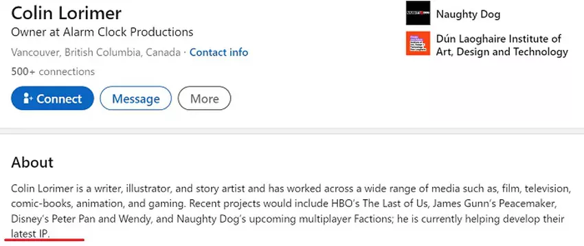 Na swojej stronie w serwisie Linkedin scenarzysta i ilustrator Colin Lorimer, który jest właścicielem firmy Alarm Clock Productions, poinformował, że obecnie aktywnie pomaga studiu Naughty Dog w pracach nad jakąś grą opartą na zupełnie nowym IP.