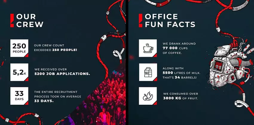11 bit studios opublikowało również kilka zabawnych "wewnętrznych" statystyk. I tak, 250 pracowników studia wypiło w ciągu roku 77 tysięcy filiżanek kawy z 5500 litrami mleka i zjadło ponad 3800 kilogramów owoców.