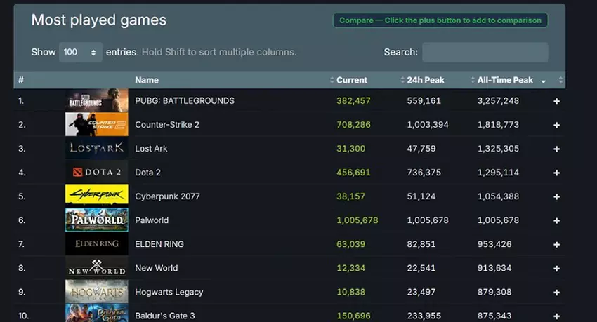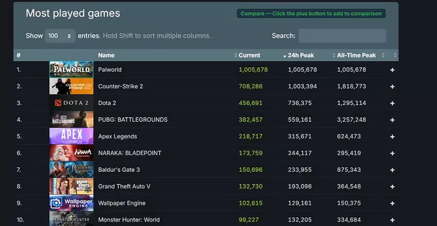Palworld jest obecnie najpopularniejszą grą na Steam, wyprzedzając takie (free-to-play) mastodonty świata gier jak Counter-Strike 2, Dota 2, PUBG i Apex Legends.