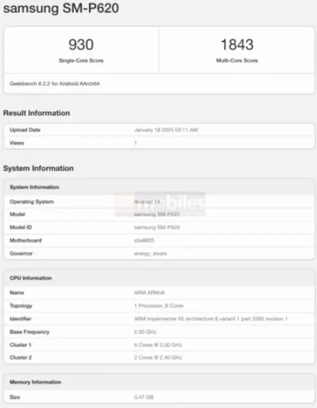 Informacją podzieliła się publikacja 91mobiles. Mowa o nowym budżetowym tablecie. Urządzenie zostało już przetestowane w Geekbench. Nowość ma numer modelu SM-P620, system Android 14 i procesor Exynos 1280. Jest to pięcionanometrowy SoC z ośmioma rdzeniami: dwoma wysokowydajnymi Cortex-A78 i sześcioma energooszczędnymi Cortex-A55. Układ jest wyposażony w modem 5G i układ graficzny Mali-G68.