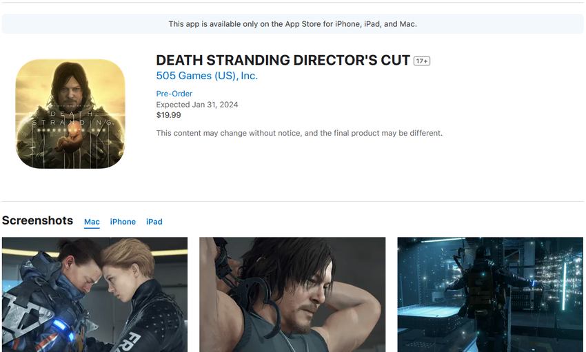 AppStore wskazuje, że Death Stranding Director's Cut pojawi się 31 stycznia, cena to 20 dolarów. Gra będzie dostępna na iPhone 15 Pro, iPhone 15 Pro Max, iPad Air i iPad Pro z procesorem M1, a także na komputerach Mac z procesorem M1.
