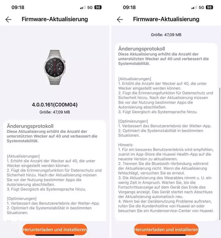 Wraz z aktualizacją systemu, Huawei Watch GT 4 otrzymał nową funkcję bezpieczeństwa, która automatycznie ostrzega użytkownika o konieczności przeprowadzenia weryfikacji danych po zakończeniu aktualizacji. Huawei dodał również do zegarka obsługę do 40 alarmów, język gruziński oraz ulepszoną aplikację pogodową.
