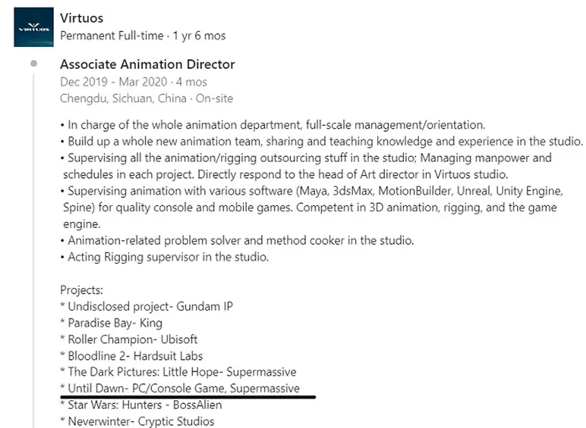 Uważni użytkownicy Reddita odkryli, że profil LinkedIn animatora Naceri Lu wskazuje, że między grudniem 2019 a marcem 2020 roku pracował on w Virtuos Studios, a jeden z projektów wskazywał na Until Dawn, i to w wersjach na PC i konsole, co jest szczególnie interesujące, bo wcześniej gra ukazała się tylko na PS4. To całkowicie koreluje ze słowami billbil-kun, który twierdzi, że ulepszona wersja Until Dawn zostanie wydana nie tylko na PS5, ale także na PC.