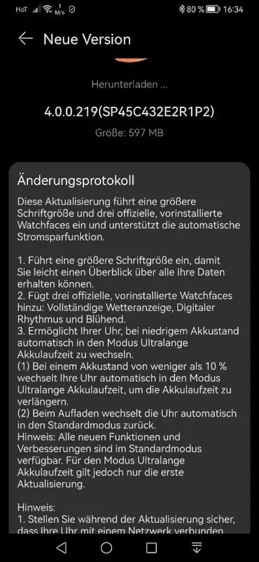 Oprogramowanie układowe zostało wydane z numerem wersji HarmonyOS 4.0.0.219 i waży 597 MB. Zgodnie z oficjalną listą zmian, deweloperzy dodali do systemu większą czcionkę, a także nowe tarcze: Full Weather, Digital Rhythm i Blooming. Ponadto zegarek otrzymał automatyczny tryb oszczędzania energii. Włącza się on, gdy zegarek ma mniej niż 10% naładowania i wyłącza, gdy gadżet jest podłączony do ładowarki.