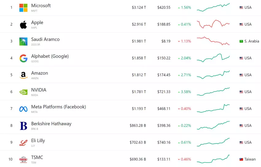 Ponadto w pierwszej dziesiątce znalazły się Alphabet (Google), Amazon, NVIDIA, Meta (Facebook) i TSMC.