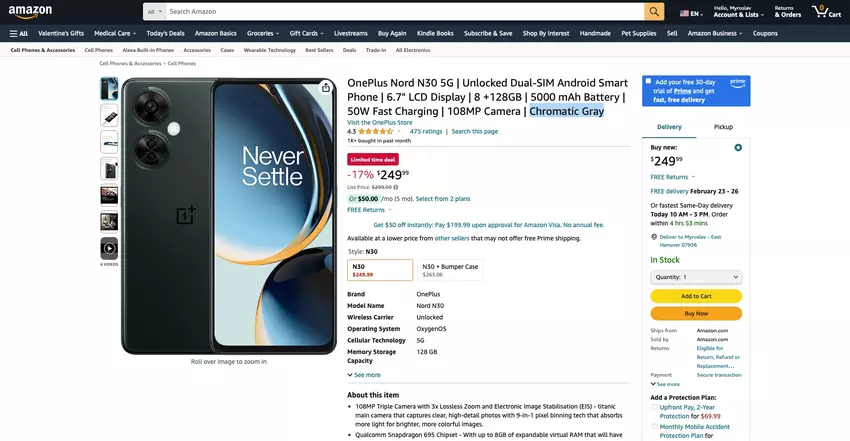 Mowa o modelu OnePlus Nord N30 5G. Gadżet można kupić na Amazon za $249.99 $299.99, -17%). Jest tylko kolor Chromatic Grey i jedna modyfikacja pamięci - 8/128 GB.