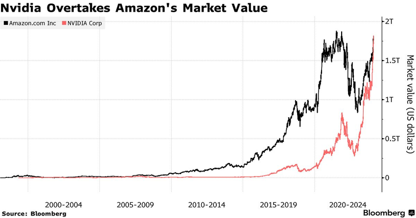 Ostatni raz Nvidia była bardziej wartościowa niż Amazon w 2002 roku, kiedy każda z nich była warta mniej niż 6 miliardów dolarów.