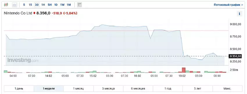Na giełdzie w Tokio akcje Nintendo spadły o 5,84% w ciągu tygodnia i w momencie pisania tej wiadomości są wyceniane na 8 356 jenów japońskich (55,65 USD po aktualnym kursie wymiany).