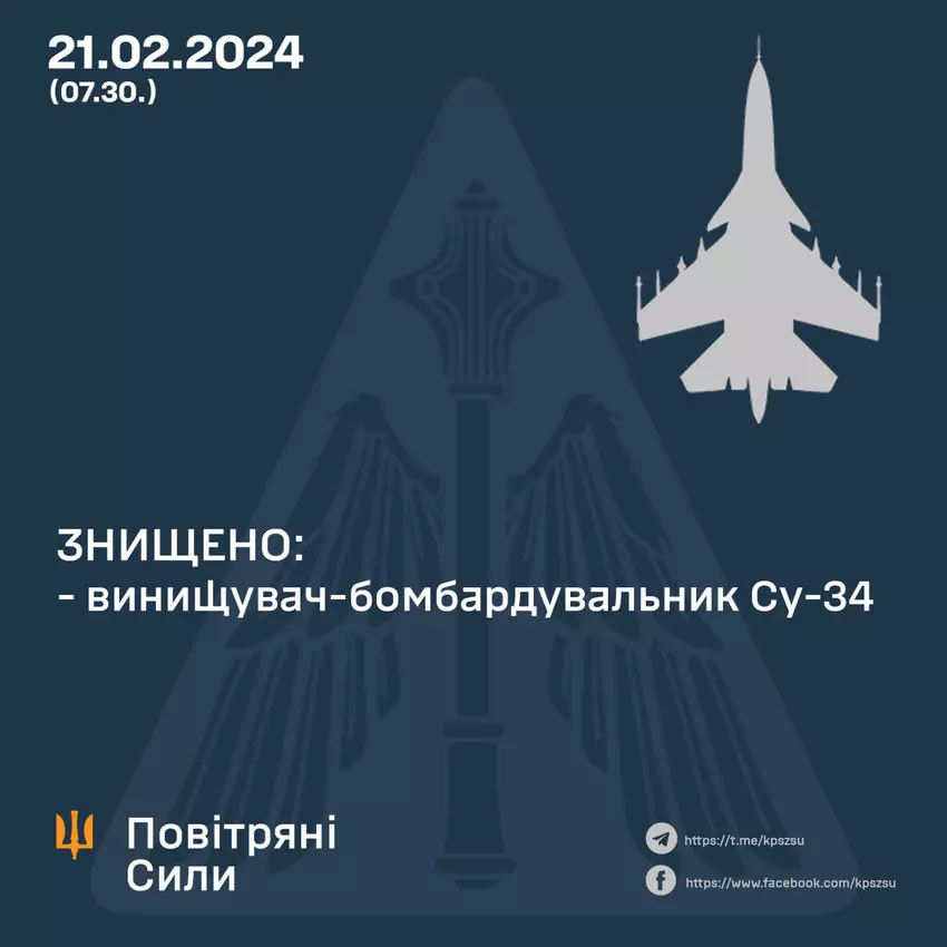 Dowódca Sił Powietrznych Sił Zbrojnych Ukrainy Mykoła Oleszczuk powiedział, że 21 lutego ukraińskie wojska zestrzeliły kolejny rosyjski bombowiec Su-34.
